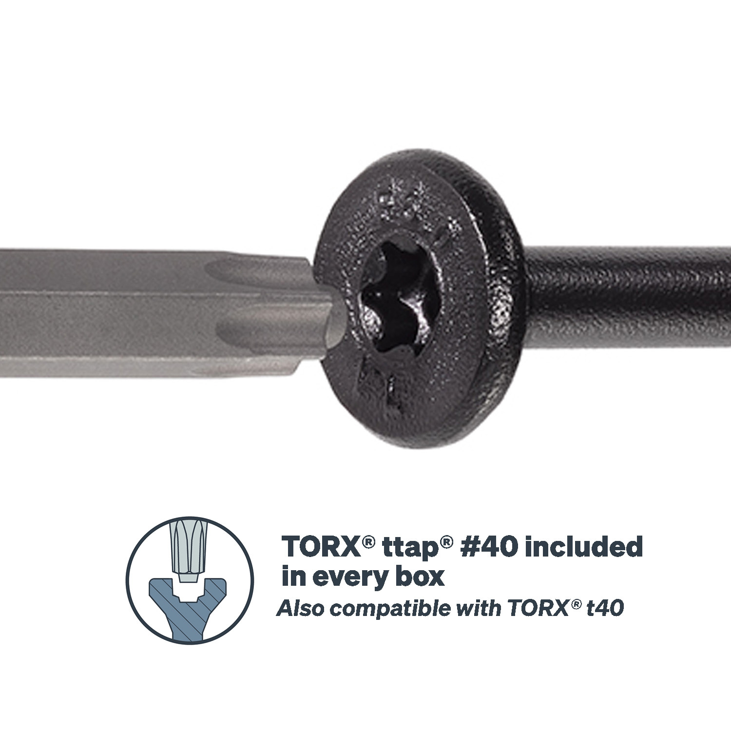 The flat head installs flush, saving additional time and money. Plus, gain stronger bit engagement with the TORX ttap drive system. Compatible with TORX® ttap® #40 or TORX® t40 bits.